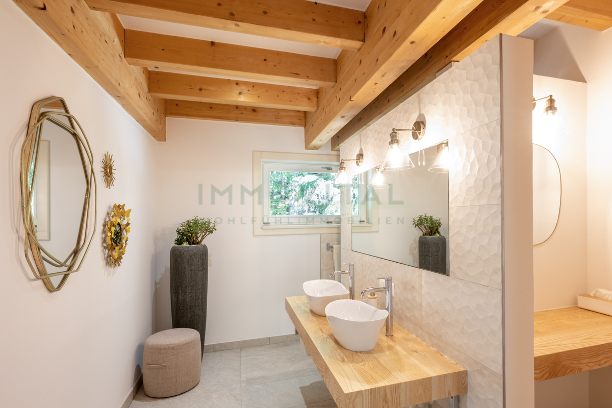 Das vollunterkellerte und mit moderner Luftwärmepumpe samt Fußbodenheizung ausgestatte Haus umfasst zwei Wohneinheiten sowie einen großzügigen Wellnessraum mit Infrarotkabine, separater Dusche und Einlagerungsräumen. Die gesamte Einrichtung des Hauses samt Bädern und Küchen wurde 2023 erneuert, eine 13,2 kWp Photovoltaik-Anlage mit 11 kWh Speicher installiert.