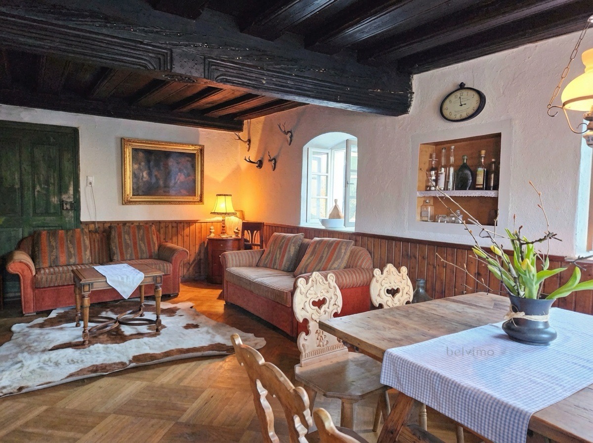 Das Haupthaus mit angrenzendem Wirtschaftstrakt gliedert sich in ein Erdgeschoß (ca. 95 m² Wohnfläche) und besteht aus einer gemütlichen Stube sowie zwei Küchen, einer separaten Toilette und einem Schlafzimmer. Das Obergeschoß (ca. 110 m² Wohnfläche) umfasst drei Schlafzimmer – teils mit Balkon – sowie ein Badezimmer mit Toilette.
