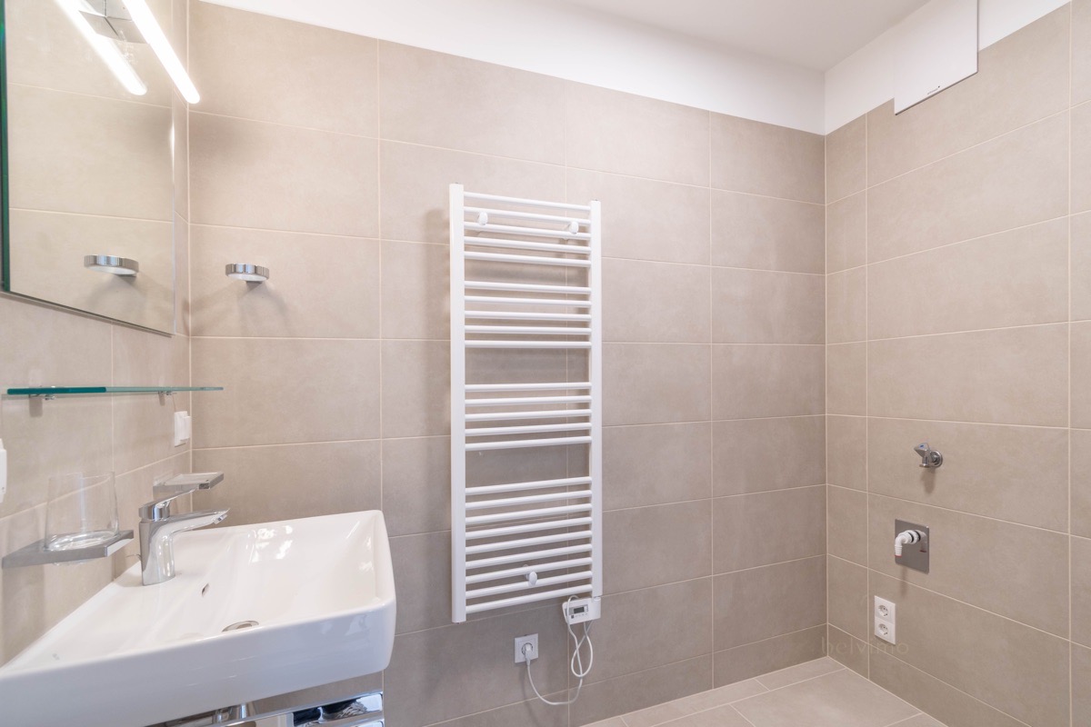 - Badezimmer mit Dusche & Handtuchtrockner, inkl. Spiegel und Accessoires